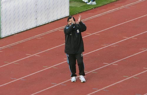 4點15分,馬拉多納走進球場,全場球迷齊聲大喊他的名字,與梅西不同的是,聽到球迷的呼喊,老馬不僅向球迷招手還邊走邊獻上飛吻。隨后,馬拉多納走到梅西面前對他面授機宜,兩人談?wù)摿舜蠹s半分鐘。之后,老馬將全體隊員召集到中圈進行布置,大約2分鐘后,老馬宣布訓(xùn)練開始,隊員們進行準備活動。在此過程中,馬拉多納在場邊走來走去,走近看臺時,球迷們再此大喊他的名字,老馬停下來向球迷招手,又一次獻上飛吻。(記者呂長偉)