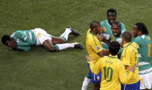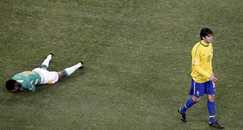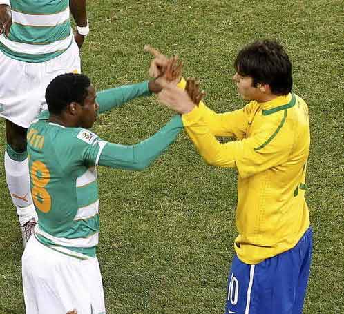 北京時間6月21日,巴西3-1戰勝科特迪瓦,比賽進行到第88分鐘,卡卡再次在無球狀態下碰倒了科特迪瓦球員,你很難說這是一個肘擊動作,現場能看見的就是科特迪瓦球員捂著臉痛苦的倒地。科特迪瓦球員立刻沖向了卡卡,卡卡則在第一時間朝后場跑去,盧西奧護在卡卡面前,更多的巴西球員跑了過來,阻擋科特迪瓦球員的沖擊,現場一片混亂。裁判走向卡卡,掏出第二張黃牌,卡卡紅牌出場。盧西奧憤怒的向裁判表示抗議,羅比尼奧也十分不理解的揮舞著雙手,但一切都已經晚了,卡卡搖著頭,微笑著退場。