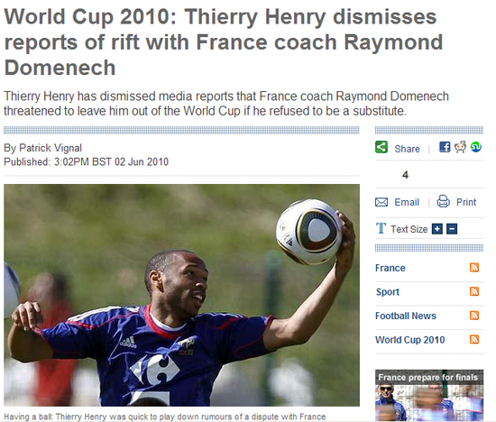 之前曾有一家地方性的媒體在報道中說亨利不甘于在世界杯上坐冷板凳,而法國主帥多梅內克回應說,如果亨利不接受做替補的安排就不帶他去南非。對此,亨利聲明這完全是無稽之談:“我并沒見過這些奇怪的報道,也不知道它們是從哪冒出來的。事實上教練只跟我說過我將不會在世界杯上首發出場,我當時坦然的接受了。”