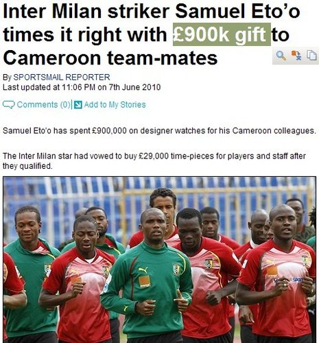 因為在對陣葡萄牙的熱身賽中吃到紅牌,所以埃托奧缺席了對陣塞爾維亞的熱身賽,缺少了埃托奧的喀麥隆最終3-4惜敗于世界杯新軍。眼看著球隊在世界杯前的熱身賽中連續輸球,埃托奧決定送給喀麥隆隊友、教練組成員以及工作人員每人一塊價值2.9磅的名貴手表,以此來鼓勵隊友一起在世界杯上打出好成績。據悉,喀麥隆代表團超過30人,埃托奧為此將花費約90萬英鎊。