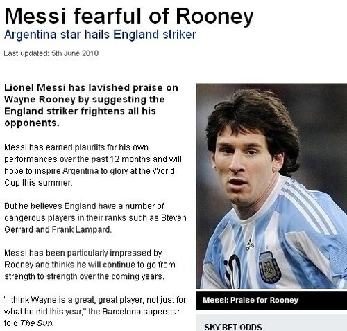 在被問及英格蘭的球員誰最優秀時,梅西毫不猶豫就說出了魯尼的名字。他說:“當然是魯尼,他是一個非常非常優秀的球員。眾所周知,魯尼在本賽季的表現棒極了,但事實上,之前的每一個賽季他都送出了值得驕傲的答卷。他是這一代球員的代表,而且每年都在進步,越來越強。”