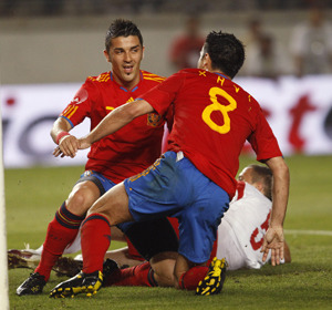 圖為西班牙隊比利亞和哈維在進球后相擁慶祝。