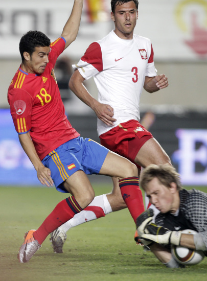 第24分鐘,阿韋洛亞傳球,比利亞禁區(qū)右側(cè)18碼處的低射偏出遠角。2分鐘后,萊萬多夫斯基直傳,佩斯科禁區(qū)右側(cè)的勁射被卡西利亞斯撲出底線。第35分鐘,伊涅斯塔傳球,比利亞禁區(qū)左側(cè)15碼處的弧線球射門落入庫茨薩克下懷。第39分鐘,伊涅斯塔受輕傷被佩德羅換下,全場球迷起立鼓掌。上半場,西班牙控球率高達74%,傳球成功率92%。