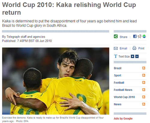 中廣網北京6月9日消息 北京時間6月9日,來自《每日電訊》消息稱,卡卡在日前透露了自己心目中的2010年世界杯最佳射手人選,分別是C羅、梅西、托雷斯和法比亞諾。
