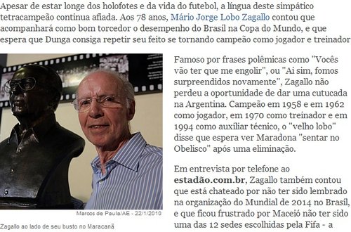 扎加洛在1958年、1962年兩次以球員身份捧得世界杯,1970年他作為主帥再次捧杯,1994年他作為助理教練再度折桂。但扎加洛看好鄧加像自己一樣,以球員、教練兩種身份奪冠:“除了我之外,貝肯鮑爾也以球員、教練兩種身份奪取過世界杯。我會為鄧加助威,因為如果巴西足球能擁有另一個這樣的明星,那是一種偉大的榮耀!