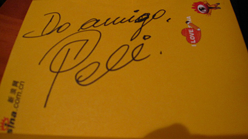 對話進行到這個時候,貝利乘坐的奔馳車開了過來。在臨分手的時候,我友好的表示邀請他有機會來中國玩。貝利很友好的在記者記錄我們談話內容的筆記本上簽下:給我的兄弟,貝利。