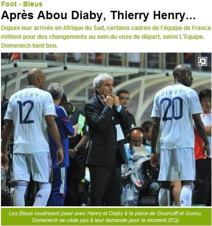 根據法國媒體《隊報》消息,法國國家隊高層欲說服多梅內克對首發陣容做出調整,換下古爾庫夫和戈武,重新啟用迪亞比和亨利。但是多梅內克始終堅持本周五世界杯首場迎戰烏拉圭依舊沿用自己的老陣型。