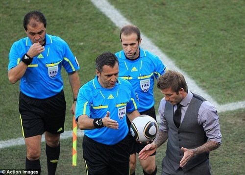 中場結束時,貝克漢姆一直等在球員通道,和每位下場的隊友擊掌,看到垂頭喪氣走下來的蘭帕德,貝克漢姆更是主動上前,重重的拍了拍隊友的肩膀。看到當場主裁準備走下場,一向溫和的貝克漢姆一路追著裁判,嘴中不停的和主裁爭論著上半場對英格蘭隊進球的誤判。盡管萬人迷一臉焦急,然而身旁的主裁卻面無表情,絲毫不理會貝克漢姆的辯解。