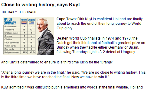 庫伊特今年29歲,在同烏拉圭的比賽上他扮演了重要的角色,保持著25場不敗記錄的荷蘭隊是否可以讓他們在最后一場決賽上也能脫穎而出。在決賽前夕,庫伊特說:“我收到了很多球迷發(fā)來的短信和郵件,雖然我不知道在決賽時我們能有什么樣的表現(xiàn),但是看他們的短信,我覺得全世界的人都在支持我們!