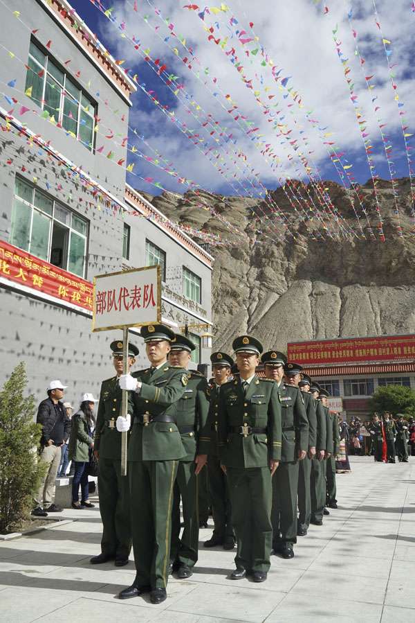 開幕式共分為五項議程。首先,來自洛扎縣各單位的8個游行方隊,共200多人,在觀眾們的歡呼喝彩聲中依次入場,順時針繞廣場一周,為開幕式預熱。其中,當地駐軍部隊的官兵步伐整齊、英姿颯爽、口號洪亮,當地百姓無一不歡呼鼓掌,也為這些平日里擔任祖國邊防重任的人民子弟兵送去節日的祝福。另外,僧尼方隊、藏戲表演隊、退休人員方隊、學生儀仗隊等方隊也都展示了各具特色的風采,現場氣氛一下子被點燃。
