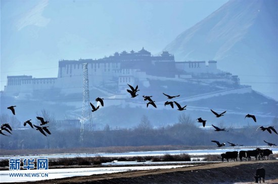 水鳥飛翔在拉魯濕地上空(1月7日攝)。入冬以來,位于拉薩城邊的拉魯濕地國家級自然保護區候鳥增多,斑頭雁、赤麻鴨、野鴨等數十種候鳥在這里過冬。拉魯濕地國家級自然保護區海拔3600多米,總面積12.64平方公里,是中國海拔最高、面積最大的城市天然濕地,被譽為“拉薩之肺”。新華社記者 張汝鋒 攝