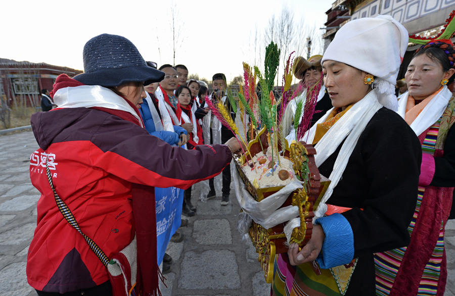11月12日,在位于拉薩市林周縣的一個家庭旅館外,藏族群眾端著切瑪盒(五谷豐收斗),迎接前來體驗藏家風情的游客。 近日,由拉薩市旅游局等主辦的“冬游藏家·拉薩人家體驗游”活動在拉薩老城區及周邊縣鄉開展,為游客提供了一次體驗雪域高原冬季獨特魅力的機會。 新華社記者 劉東君 攝