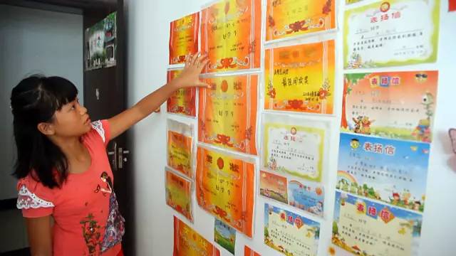 肖夢蕊的房間里貼滿了獎狀。還有一個梳妝臺,是媽媽花200塊錢從舊貨市場上買的。時隔三個月再次見面,肖夢蕊非常熱情,就像見到老朋友一樣。