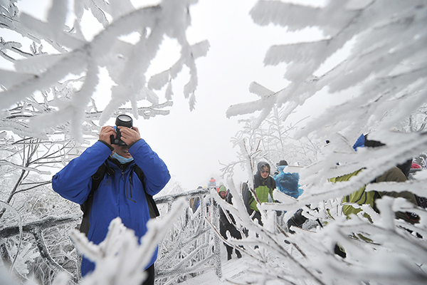 當日,受大幅降溫天氣影響,我國多地出現(xiàn)霧凇景觀,令游客流連忘返。