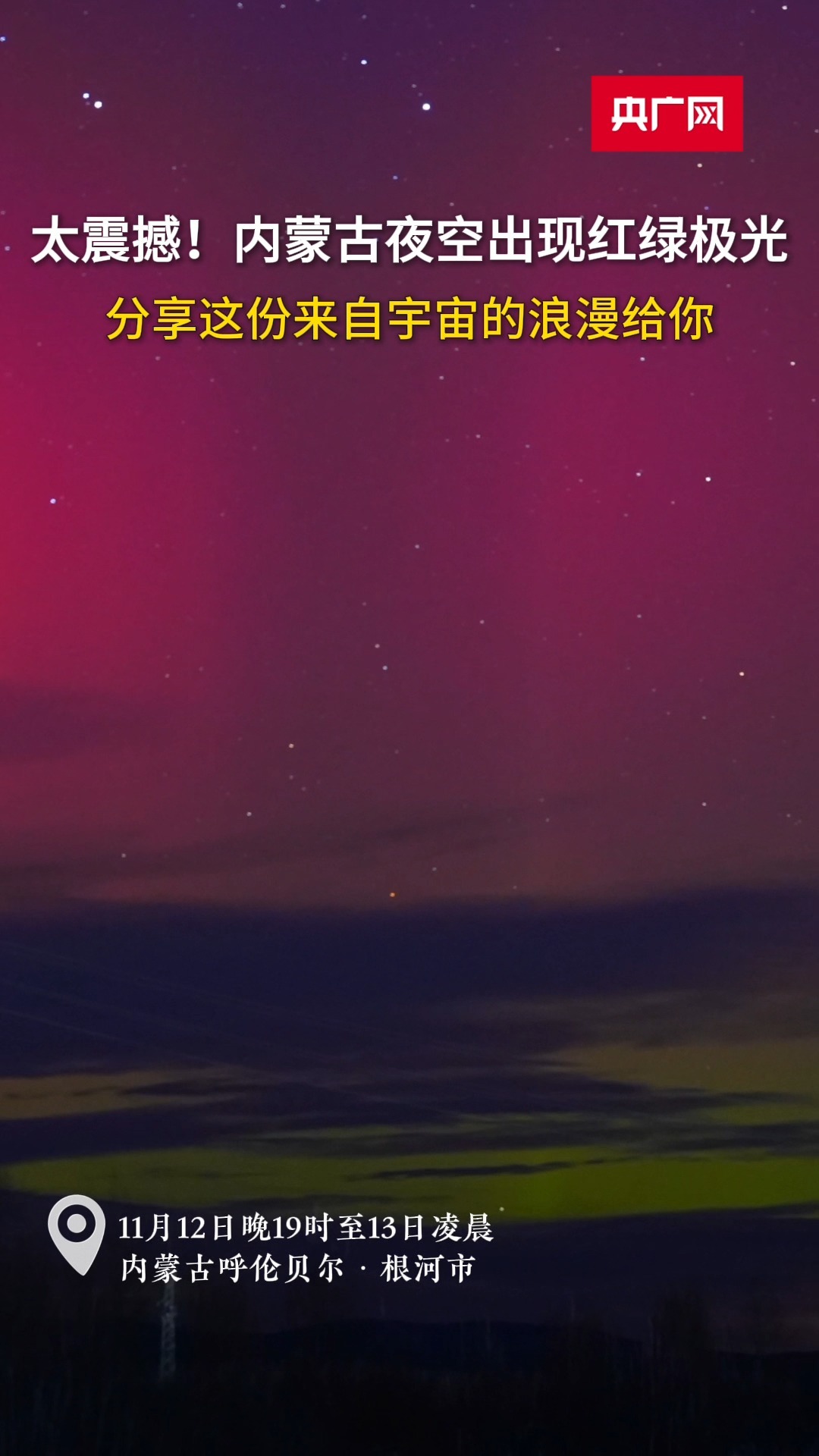 11月12日-13日,位于內蒙古自治區呼倫貝爾根河市全域范圍內現紅綠色極光,極光絢爛,暈染夜空,似切開的“巨型西瓜”,將小城的夜空照亮。
