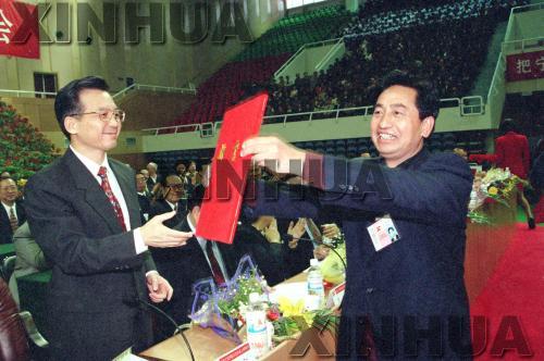 1998年10月25日,寧夏各族各界5000多人在銀川寧夏體育館隆重集會,熱烈慶祝寧夏回族自治區成立40周年。 中共中央政治局委員、書記處書記、國務院副總理中央代表團團長溫家寶出席大會并發表重要講話。國務委員兼國務院秘書長、中央代表團副團長王忠禹宣讀了中共中央、全國人大常委會、國務院、全國政協、中央軍委為慶祝寧夏回族自治區成立40周年發來的賀電。 在慶祝大會上,溫家寶將中央代表團精簡、節約下的慶祝活動經費交給西海固行署專員馬金虎,用來支持西海固地區建設。新華社記者 白連鎖 攝