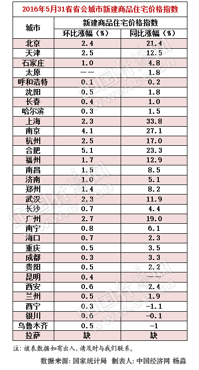 從表格來看,今年5月31省省會(huì)城市新建商品住宅價(jià)格指數(shù)與2015年比較,北京、上海、合肥、南京在內(nèi)的4個(gè)城市房?jī)r(jià)的同比增長(zhǎng)幅度比較大,分別增長(zhǎng)了21.4%、33.8%、23.3%、27.1%,漲幅均超過20%。中國(guó)經(jīng)濟(jì)網(wǎng)發(fā)現(xiàn),與去年相比,房?jī)r(jià)同比跌幅最大的城市是西寧,跌幅為1.1%。