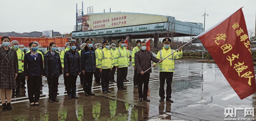 2月4日中午,在連綿冷雨中的粵北省界,開陽高速路政大隊副大隊長許佳生接過鮮紅的“疫情防控黨團支援隊”旗幟,在他身后的隊員們共同舉手宣誓:“聽從指揮,積極行動,堅決守好廣東北大門!打贏疫情防控阻擊戰!”他們是廣東省高速公路有限公司從各高速路段抽調派赴粵北增援防疫工作的第一批10名隊員,隨行而來的還有消毒酒精、手套、口罩等一批防疫物資。