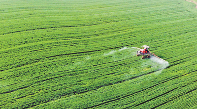 日前在湖北省襄陽市高新技術產業開發區李沖村,大型植保機械在麥田噴灑農藥和葉面肥。